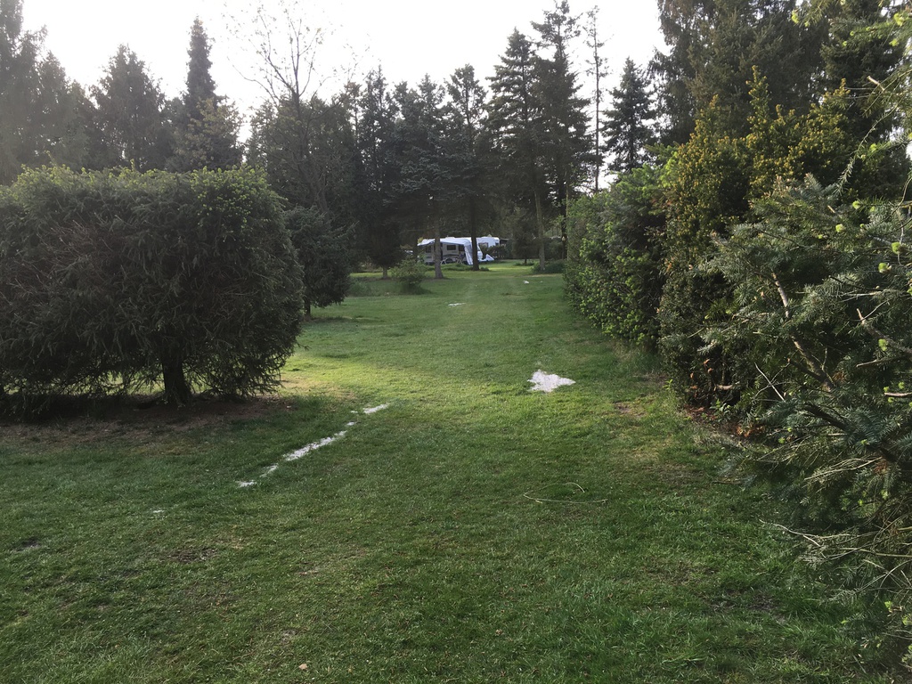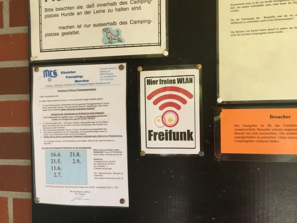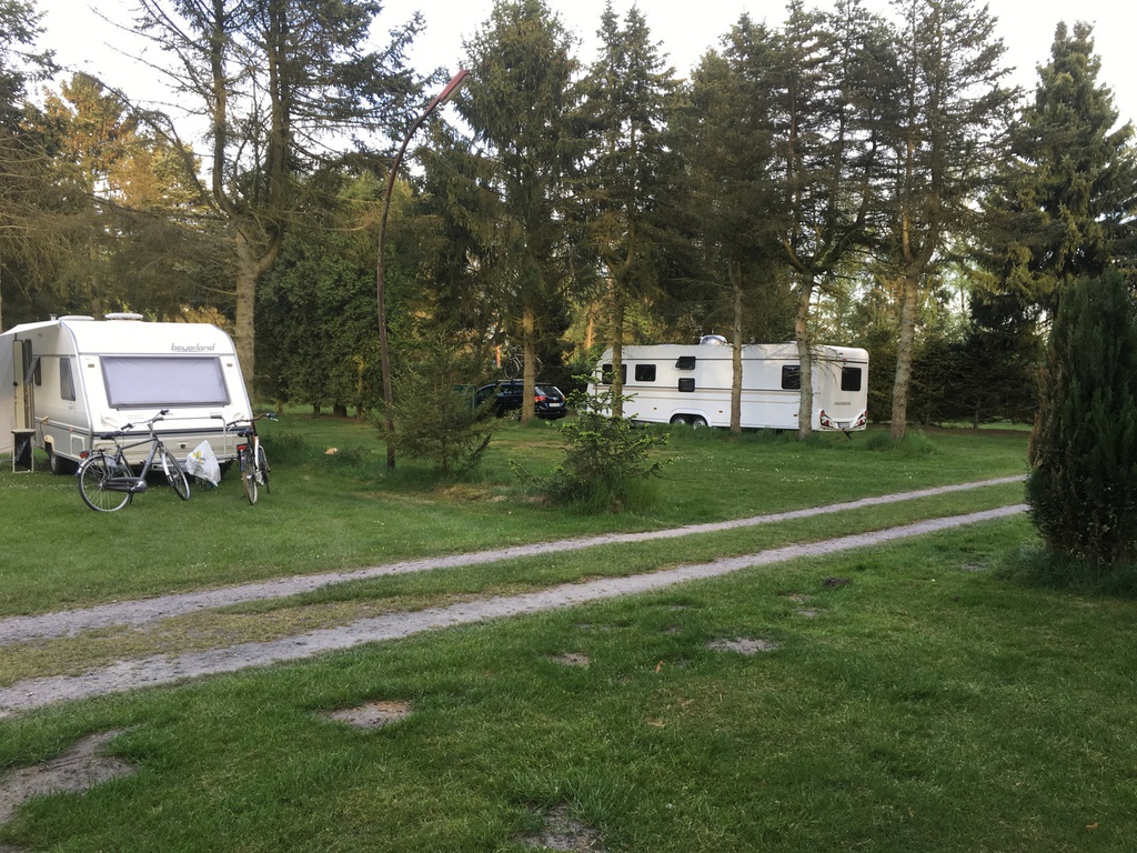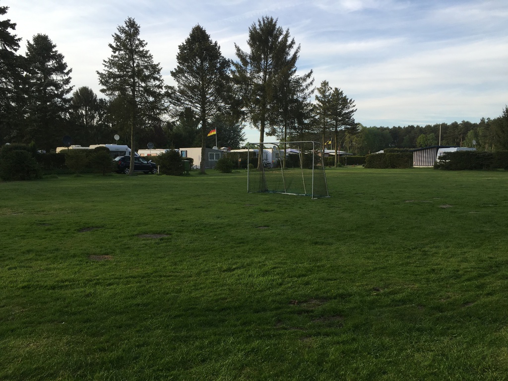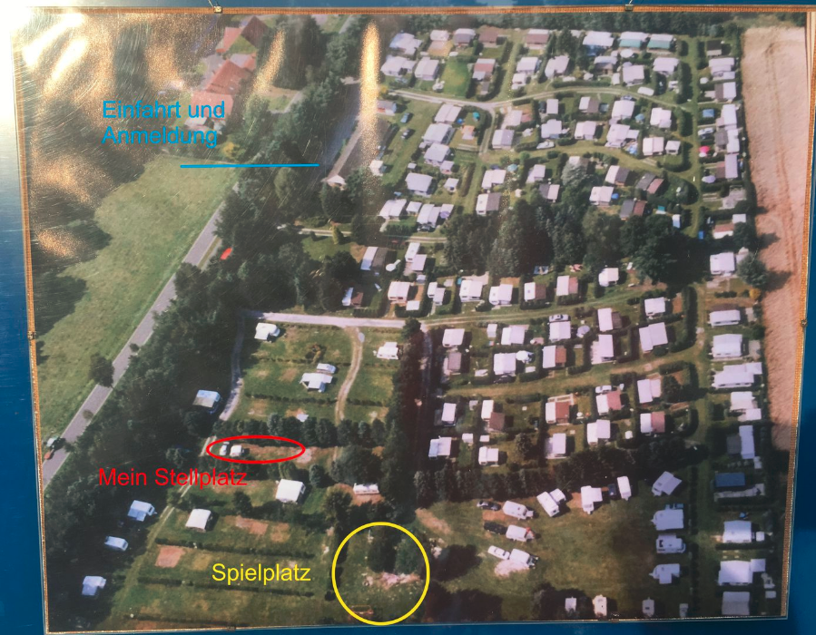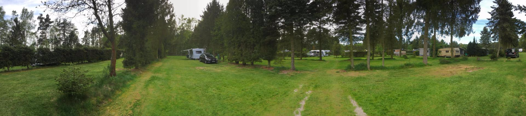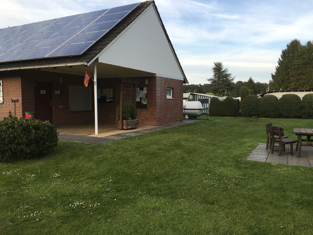Nachdem ich schnell ein Anmeldeformular ausfüllen musste (Name und Adresse) und mir div. Duschmarken gekauft habe, hat Herr Sickelmann mich direkt zu meinem Platz geführt. Auf Grund der Tatsache dass im Augenblick noch nicht so viel los ist konnte ich mir meinen Platz allein aussuchen. Der gesamte Platz hat festen Rasenboden und die einzelnen Stellplätze sind Reihenweise mit Tannen bzw. Hecken abgegrenzt. Auf den Zufahrten ist genügend Platz sodass auch ich mit meinem Gefährt nicht Rangieren musste. Leider gibt es auf dem gesamten Gelände kein WLAN. Dieses ist nur im Bereich der Rezeption als offenes verfügbar, was aber Mist ist. Man sollte sein Eigenes bei haben.